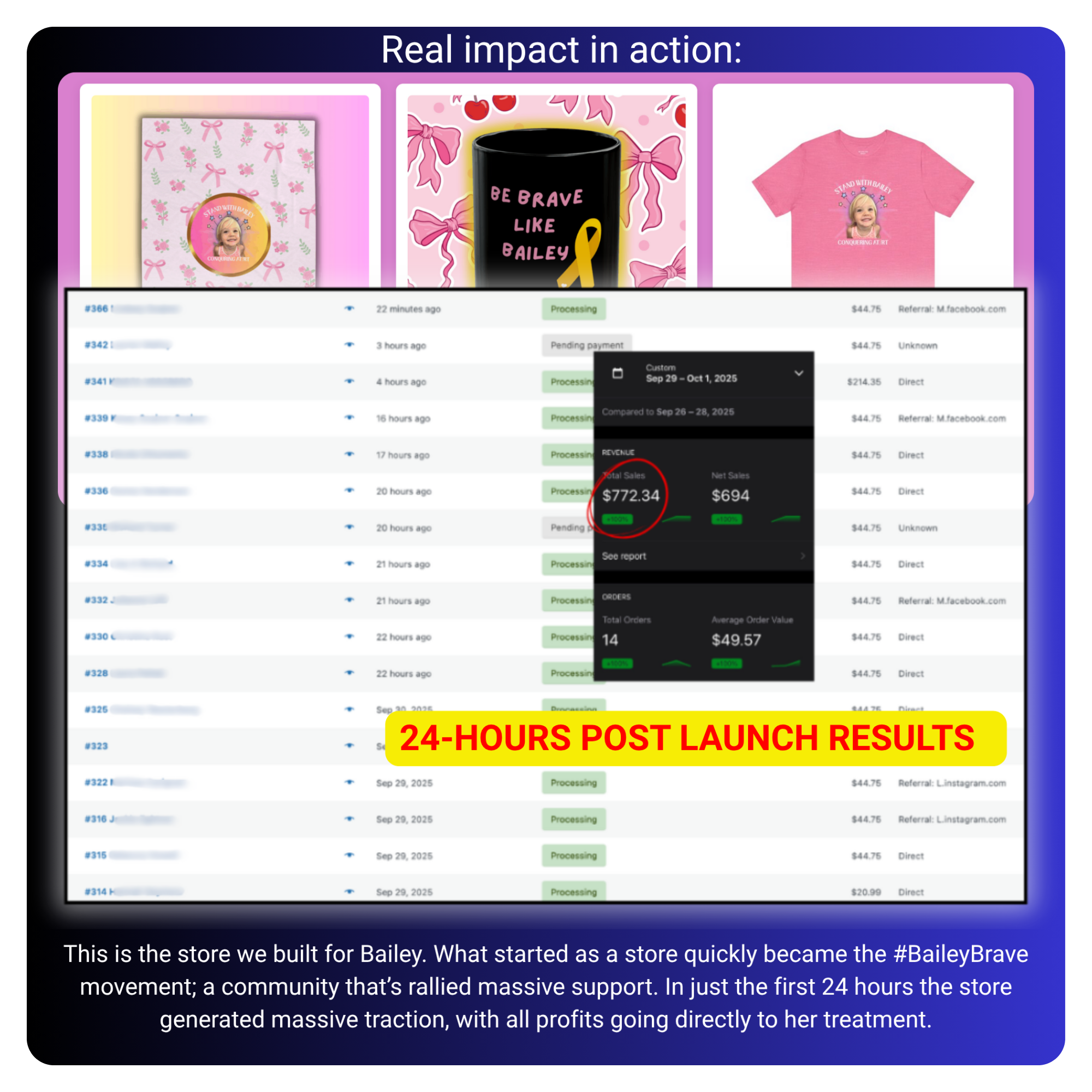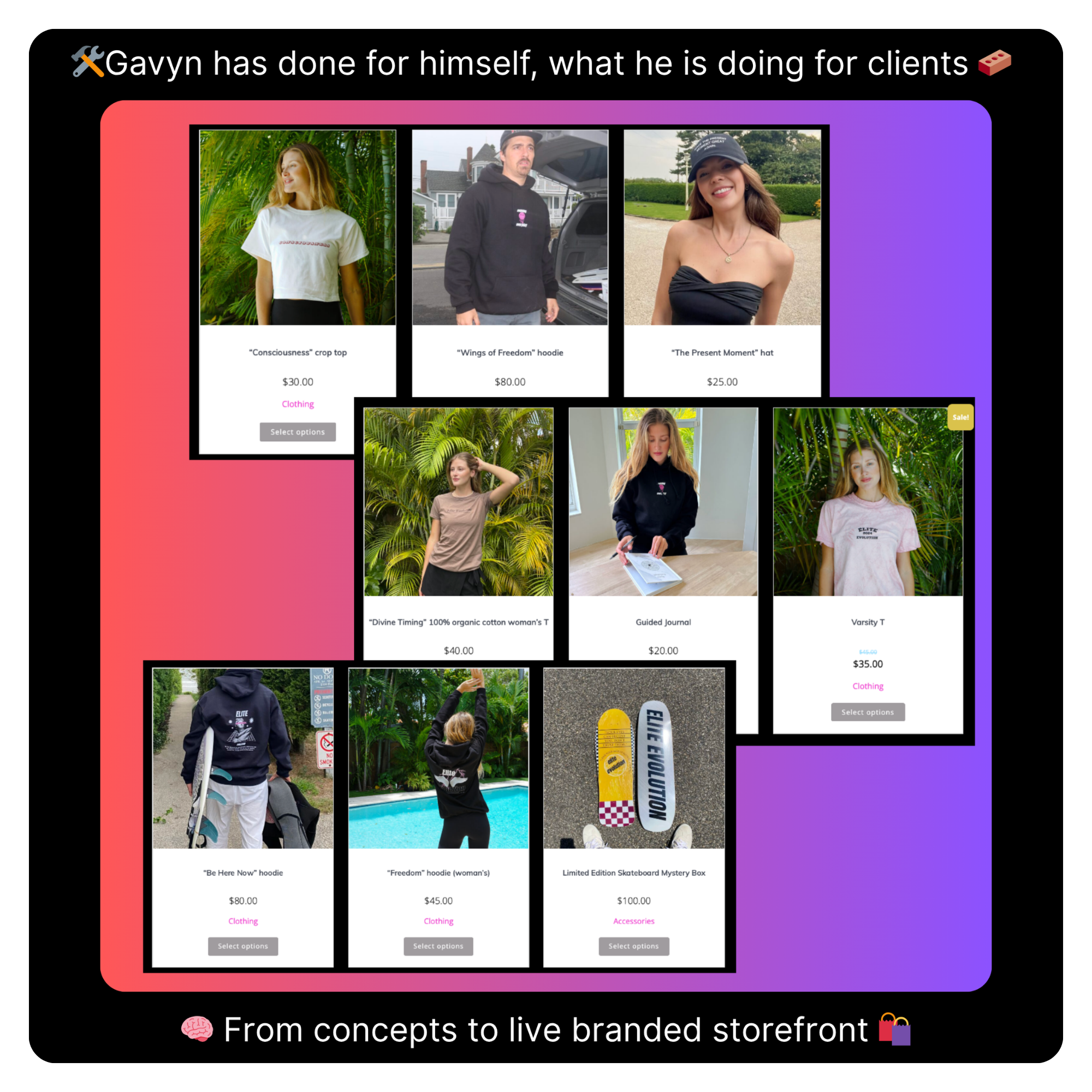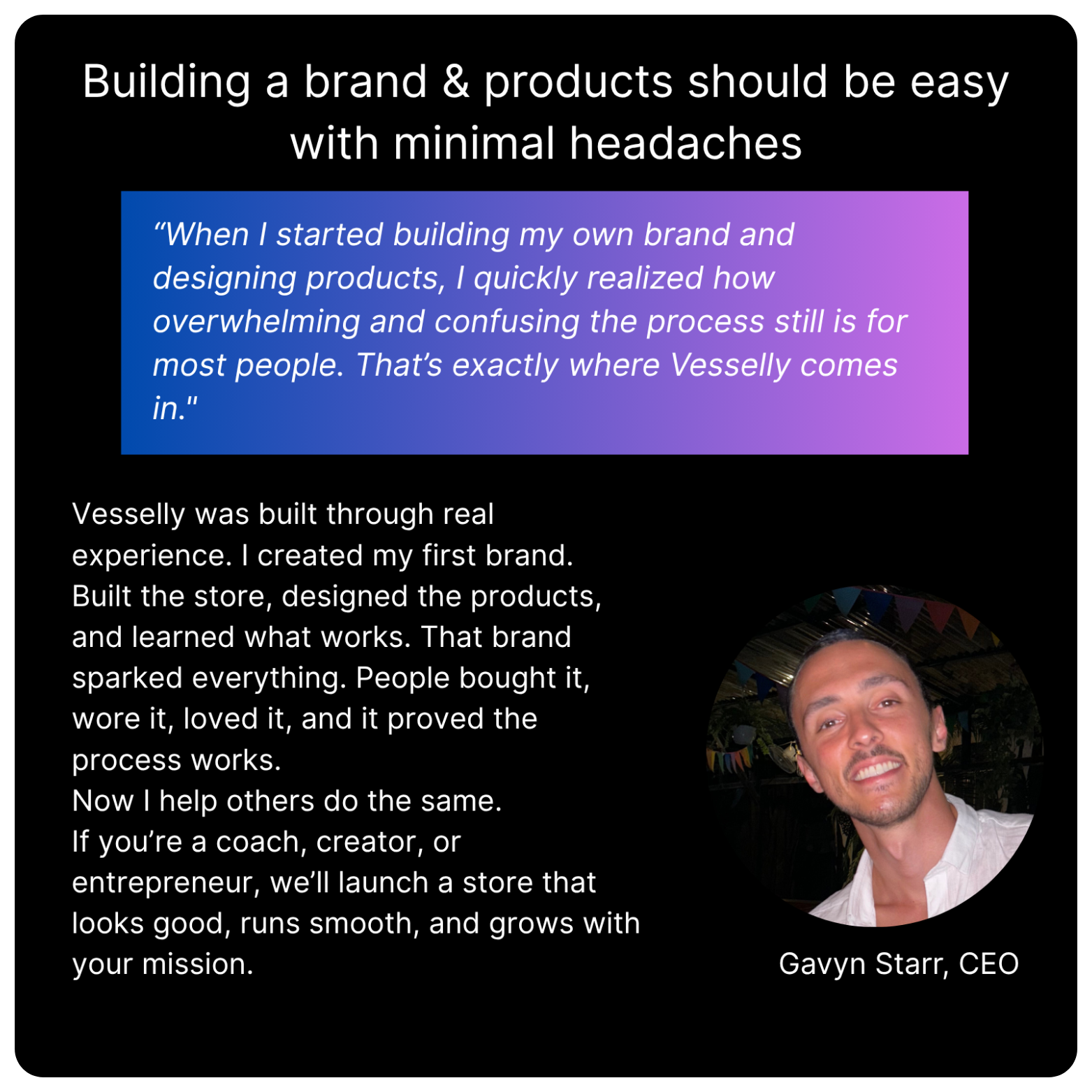 Vesselly was born out of Gavynâs first brand build. “I learned the tech, what worked, and what didnât. From there I began helping other creators like Bradley and Kate. Then life hit close to home: my cousin was diagnosed with a serious illness, and I built her a store to help her family manage treatment costs. Seeing how fast her community rallied opened my eyes to the power of a storefront with purpose and it became the foundation of Vesselly: building stores that donât just look good, but create real results.”