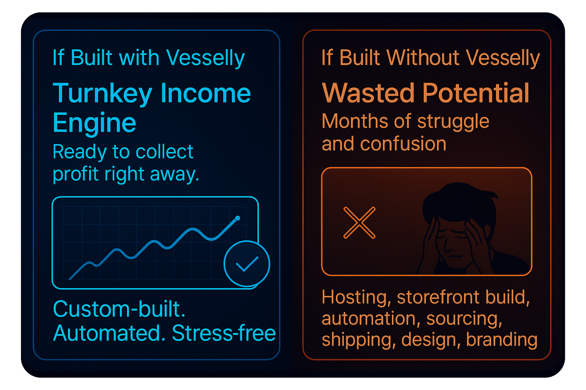 Shopify charges monthly fees, limits control, and isnât truly done-for-you. With Vesselly, we build on WooCommerce for full creative freedom and a one-time build thatâs fully yours. Hosting or maintenance is optional. Unlike other builders who just launch a site, we help you develop what youâre selling and support your growth long after launch